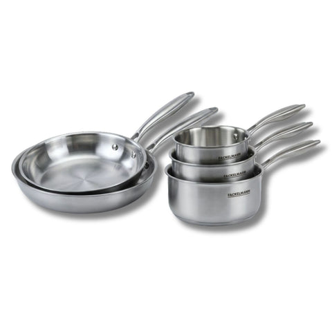 Découvrez l'ensemble Fackelmann Vita3, comprenant deux poêles et trois casseroles en acier inox 18/10. Profitez d'une cuisson homogène et saine grâce à la technologie triply. Compatibles tous feux, y compris induction.