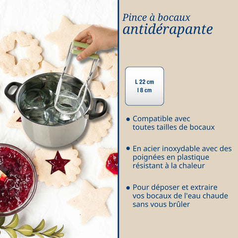 La pince à bocaux antidérapante assure une manipulation sécurisée des bocaux chauds. Elle est fabriquée en acier inoxydable de haute qualité, garantissant une solidité et une résistance exceptionnelles. La pince à bocaux antidérapante est équipée de mâchoires en acier inoxydable qui offrent une prise ferme et sécurisée, même avec des bocaux très chauds. La poignée ergonomique en plastique assure une prise en main confortable et sécurisée, réduisant ainsi le risque de brûlures.