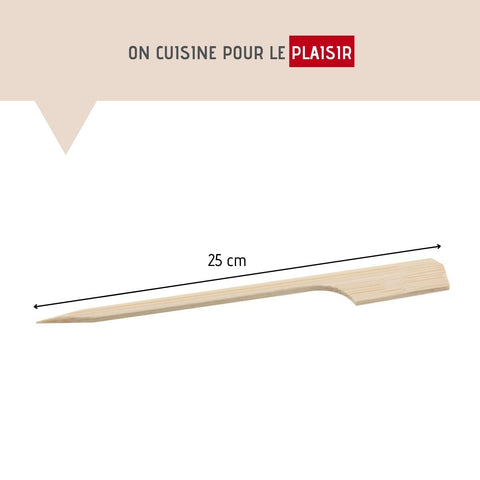 Ces pics à brochettes sont vendus par 50 et mesurent 25 cm, la longueur parfaite pour une brochette apéro, une brochette de crevettes marinées, une brochette de fruits frais. Vous pouvez également réaliser des brochettes de fromage ou de légumes panés en les faisant frire directement au bout de la brochette.