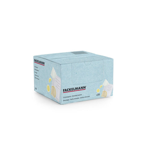 Fackelmann propose cette boîte en carton contenant 250 rince doigts au citron. Les rince doigts sont utilisés pour débarrasser les doigts et les mains des mauvaises odeurs et de la graisse.