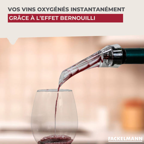 L'aérateur de vin Fackelmann est un accessoire essentiel pour tout amateur de vin. Il accélère l'oxygénation du vin grâce à l'effet Bernoulli, qui permet d’améliorer le bouquet et la saveur. Lors de son écoulement à travers l'aérateur, le vin est oxygéné grâce au principe de Bernoulli. Les tanins sont ainsi adoucis et les arômes déployés instantanément.