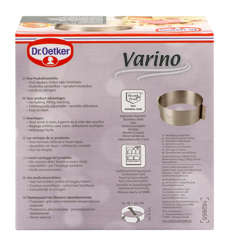 Dr. Oetker vous propose ce cercle à pâtisserie en plastique réglable en diamètre de 16 à 30 cm et mesurant 8 cm de hauteur. Le cercle à pâtisserie est un ustensile de pâtisserie pratique permettant de créer des gâteaux hauts, de garnir un cheesecake, de monter un entremet et encore bien d'autres possibilités. Fabriqué en acier inoxydable de haute qualité, il passe au lave-vaisselle sans problème. Cet ustensile de pâtisserie vous accompagnera lors de la création d'un joli dessert gourmand à partager, ou non, avec votre entourage.