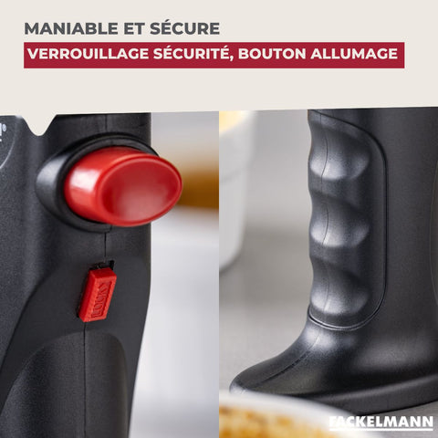 Découvrez le chalumeau de cuisine piézoélectrique Fackelmann avec flamme réglable. Il est idéal pour apporter une touche professionnelle à vos plats et caraméliser, gratiner, flamber etc...