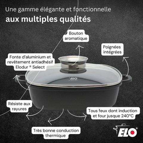 Découvrez la cocotte carrée Elo Alucast de 28 cm, alliant l'aluminium moulé noir, le verre et l'acier. Dotée d'un revêtement antiadhésif ELODUR® Select, elle est compatible tous feux et four.