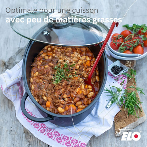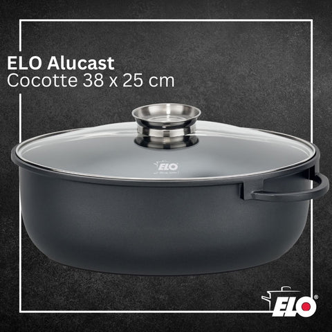 Découvrez la cocotte Elo Alucast ovale en aluminium moulé noir, élégante et fonctionnelle. Dotée d'un revêtement antiadhésif ELODUR® Select, elle est compatible tous feux et four.