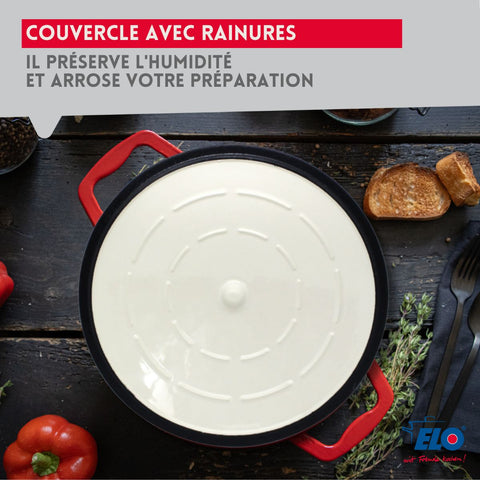 Cette cocotte Elo est en fonte émaillée de haute qualité. La fonte assure une répartition parfaite et uniforme de la chaleur sur le fond et les côtés. Le couvercle de la cocotte en fonte est doté de rainures conçues pour condenser l'humidité et la faire retomber uniformément sur les aliments, les gardant juteux et tendres tout en préservant leurs saveurs naturelles.