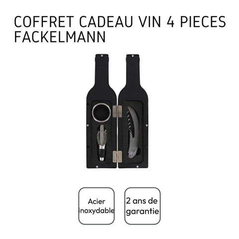 Fackelmann vous propose ce coffret pour bouteille de vin que vous pouvez offrir aux amateurs de vin rouge ou de vin blanc. Ce coffret contient un tire-bouchon limonadier, un collier pour bouteille de vin et un bouchon verseur, le tout disposé dans une jolie boîte de rangement en forme de bouteille de vin.