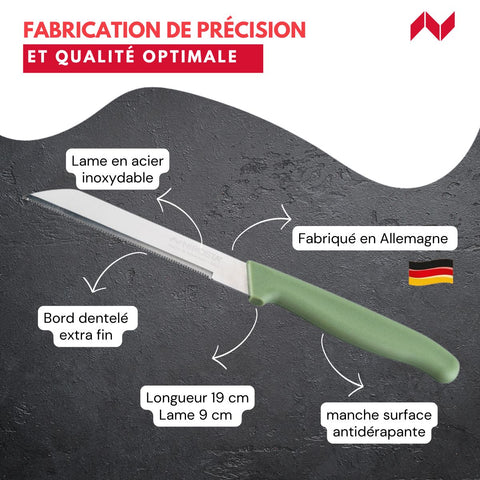 Son manche vert en PP offre une prise en main optimale grâce à sa surface antidérapante. Ce couteau fabriqué en Allemagne allie un design coloré à une fabrication de précision et une qualité optimale. Il se nettoie à la main.