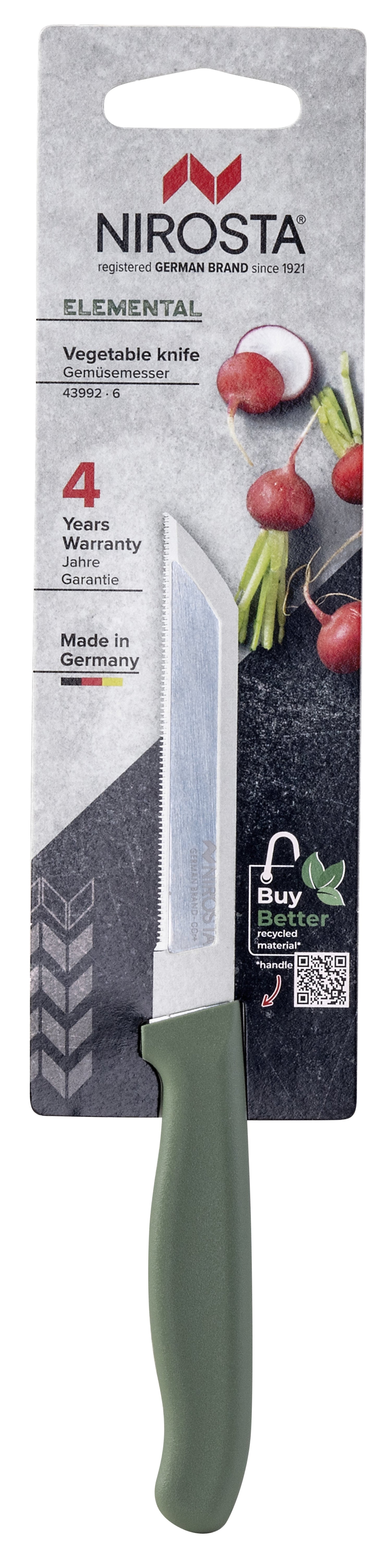 Découvrez le couteau à légumes Nirosta Elemental, idéal pour découper fruits et légumes avec précision. Sa lame dentelée extra-fine en acier inoxydable et son manche antidérapant assurent confort et sécurité lors de son utilisation.