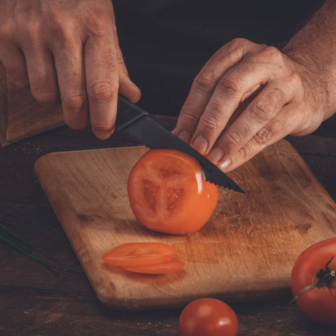 Le couteau de cuisine en acier inoxydable est parfait pour toutes sortes de fruits et légumes. Le couteau (23 cm) possède une lame en acier inoxydable (11 cm) et un revêtement antiadhésif noir de haute qualité. La poignée douce au toucher est en plastique gris-noir et est confortable à tenir. Le couteau se nettoie facilement à la main et est garanti 4 ans.