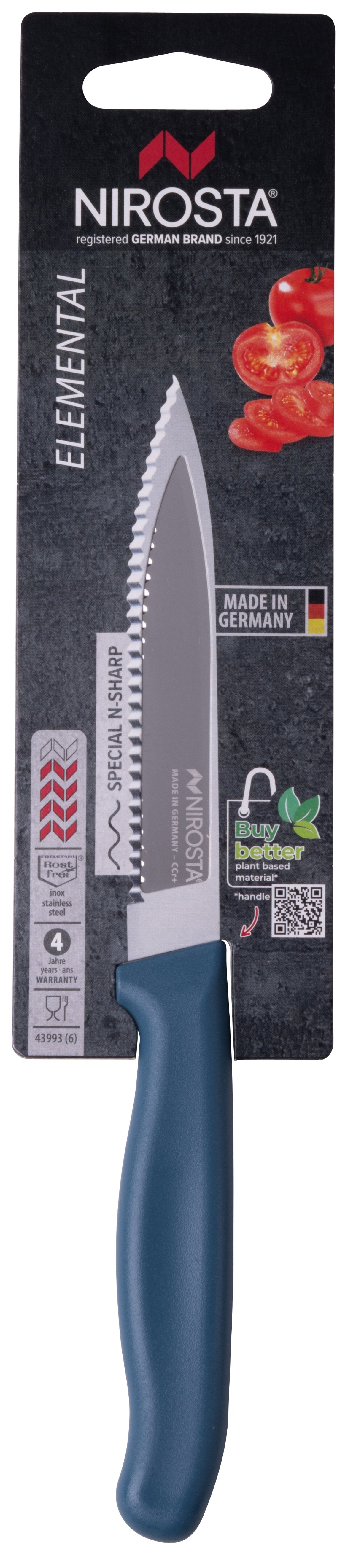 Découvrez le couteau de cuisine Nirosta Elemental, parfait pour tous les travaux de découpe. Efficace avec les légumes et fruits à peau dure, sa lame dentelée en acier inoxydable assure une coupe facile. Pratique, son manche antidérapant garantit confort et sécurité.