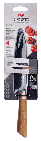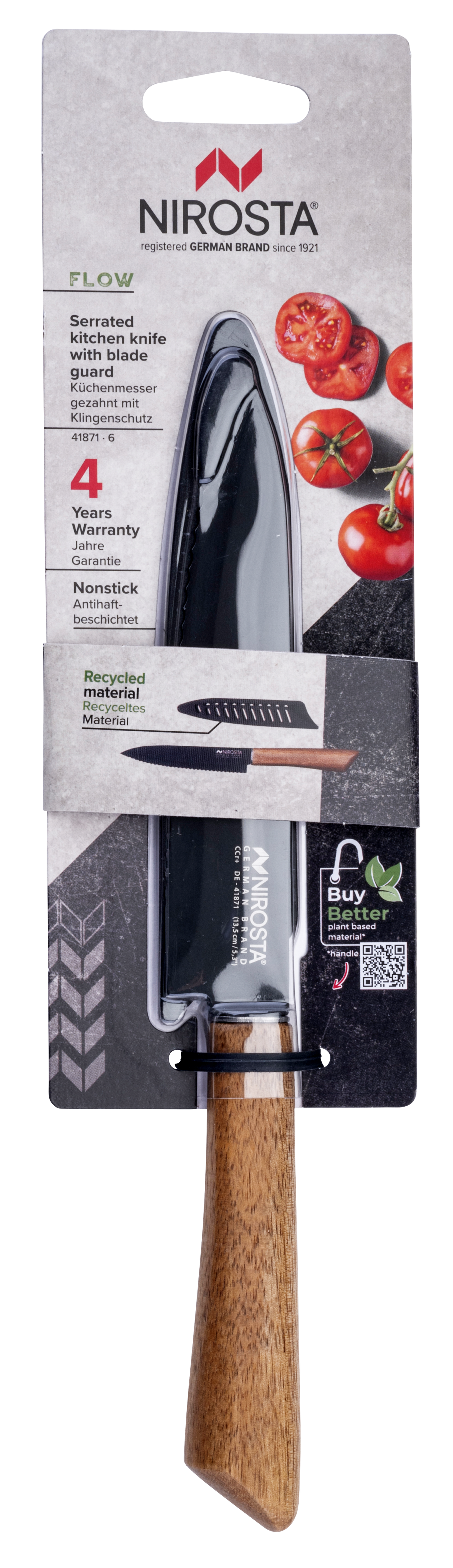 Découvrez le couteau de cuisine Nirosta Flow au design rétro plein de charme. Il allie une lame crantée de 13,5 cm et un manche en bois d'acacia qui assure confort et praticité. Parfait pour toutes vos découpes au quotidien.