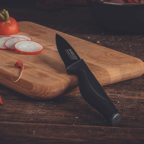 Le couteau d'office Nirosta est parfait pour couper les légumes. Le couteau possède une lame de 8 cm avec un revêtement antiadhésif noir de haute qualité. La poignée douce au toucher est en plastique gris/noir et confortable à tenir. Le couteau se nettoie facilement à la main et est garanti 4 ans.