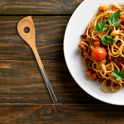 La cuillère en bois est un ustensile de cuisine presque indispensable au quotidien car elle permet de remuer les légumes dans la poêle sans l'abîmer, de mélanger le risotto avec le fromage et les champignons. Cette cuillère en bois est biseautée et possède un trou qui permet de doser les spaghettis correctement.