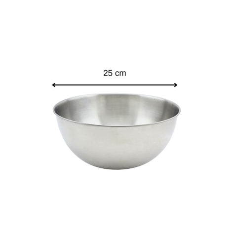 Cet ustensile de pâtisserie et de cuisine est appelé un bol à mixer et il est indispensable à la préparation de toute vos recettes. Le bol à mixer est fabriqué en inox mat et mesure 25 cm de diamètre. Cet accessoire de pâtisserie est aussi utilisé en cuisine en tant que saladier, pour faire de la mayonnaise et autre. En pâtisserie, ce bol à mixer vous servira à mélanger tous vos ingrédients avant de mettre votre pâte dans un moule à gâteaux pour la faire cuire.
