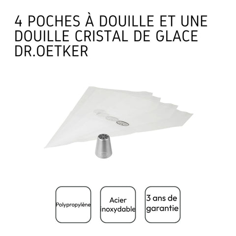 Sublimez vos pâtisseries avec la douille cristal de glace Dr Oetker et ses quatre poches à douille transparentes. La douille cristal de glace est l'élément phare pour des pâtisseries et gâteaux à partager. Laissez parler votre créativité et troquez la traditionnelle bûche de Noël pour des cupcakes originaux et en accord avec la saison des fêtes de fin d’année. Vous pouvez aussi décorer votre bûche de Noël avec de délicats cristaux de glace et lui donner ainsi un aspect original et travaillé. En acier inoxydable, la douille cristal de glace se nettoie au lave-vaisselle, est réemployable et résistante. Les poches à douilles, quant à elles, sont à usage unique et leur transparence vous guide pour un dosage parfait.