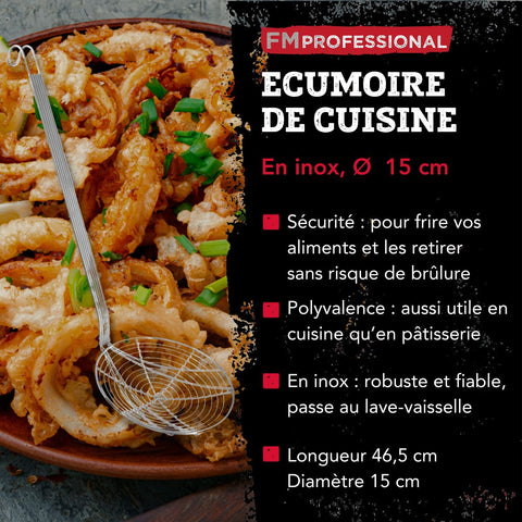 FM Professional vous propose cette écumoire araignée de cuisine en acier inoxydable avec un très long manche et un diamètre de 16 cm. Cette écumoire est pratique pour faire frire des beignets, des churros, des nuggets et autres.
