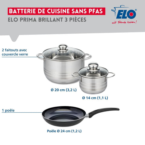 Ensemble de 1 Poêle de cuisson 24 cm et 2 faitouts 14 et 20 cm Elo Prima Brillant
