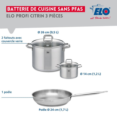 Découvrez l'ensemble de cuisine Elo Profi Citrin, comprenant une poêle de cuisson de 24 cm et deux faitouts de 14 et 26 cm. Fabriqués en inox robuste, ces ustensiles garantissent une excellente conduction de la chaleur et une compatibilité avec tous les types de feux, y compris l'induction. Les poêles Profi Therm et les faitouts sont conçus sans revêtement et sans PFAS, assurant une cuisine saine et sécurisée. Idéal pour les cuisiniers exigeants, cet ensemble allie fonctionnalité et élégance.
