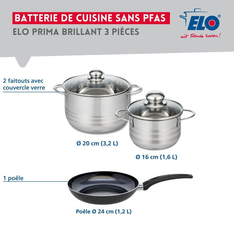 Ensemble de 1 Poêle de cuisson 24 cm et 2 faitouts 16 et 20 cm Elo Prima Brillant