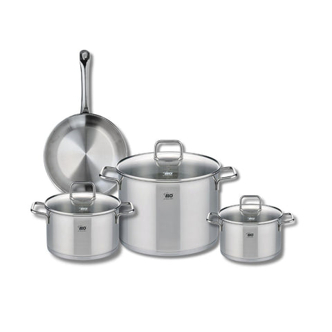 Découvrez l'ensemble de cuisine Elo Profi Citrin, composé d'une poêle de cuisson de 24 cm et de trois faitouts de 16, 20 et 26 cm, parfait pour tous vos besoins culinaires.