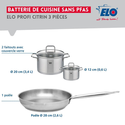 Découvrez l'ensemble de cuisine Elo Profi Citrin, qui allie fonctionnalité et élégance. Ce lot comprend une poêle de cuisson de 28 cm et deux faitouts de 12 cm et 20 cm, tous fabriqués en inox de haute qualité, garantissant une robustesse exceptionnelle et une excellente conductivité thermique.