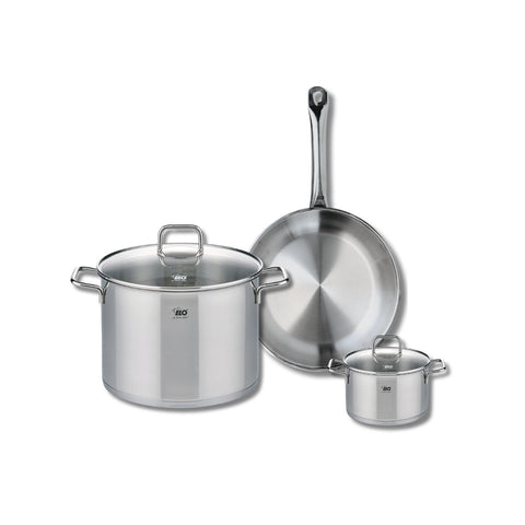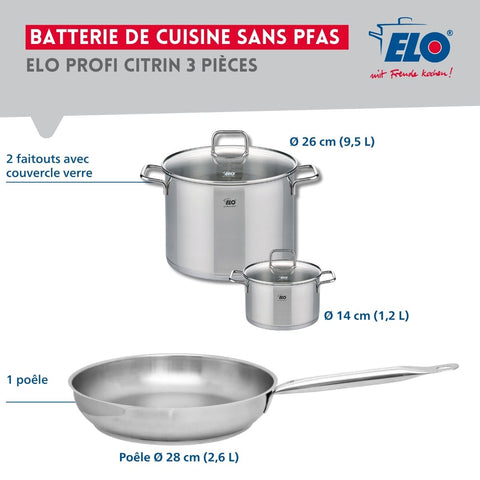 Découvrez l'ensemble de cuisine Elo Profi Citrin, un ensemble complet qui répond à tous vos besoins culinaires. Cet ensemble comprend une poêle de cuisson de 28 cm et deux faitouts de 14 et 26 cm, tous fabriqués en inox de haute qualité, garantissant robustesse et performance.