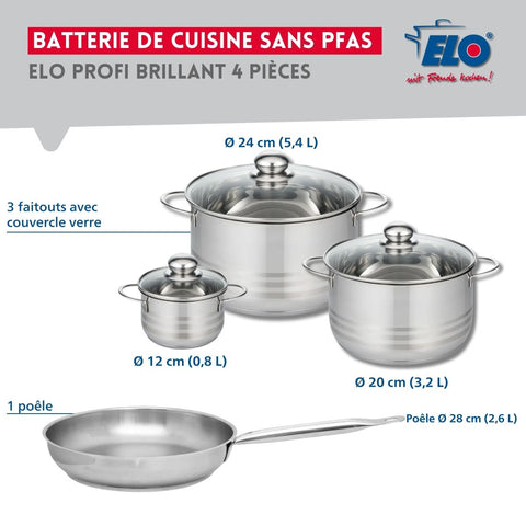 Ensemble de 1 Poêle de cuisson 28 cm et 3 faitouts 12, 20 et 24 cm Elo Profi Brillant