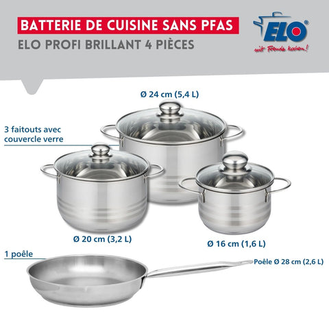 Ensemble de 1 Poêle de cuisson 28 cm et 3 faitouts 16, 20 et 24 cm Elo Profi Brillant