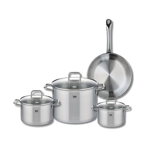 Découvrez l'ensemble de cuisine Elo Profi Citrin, une batterie de cuisine en inox conçue pour répondre à tous vos besoins culinaires. Cet ensemble se compose d'une poêle de cuisson de 28 cm et de trois faitouts de 16, 20 et 26 cm, offrant une polyvalence inégalée pour vos préparations.