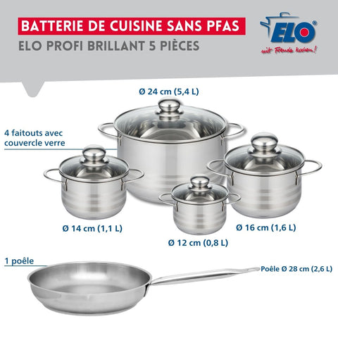 Ensemble de 1 Poêle de cuisson 28 cm et 4 faitouts 12, 14, 16 et 24 cm Elo Profi Brillant