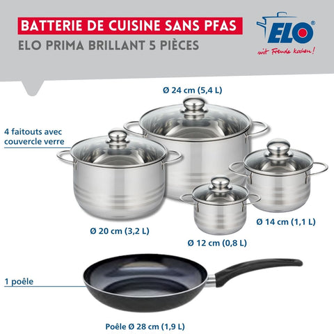 Ensemble de 1 Poêle de cuisson 28 cm et 4 faitouts 12, 14, 20 et 24 cm Elo Prima Brillant