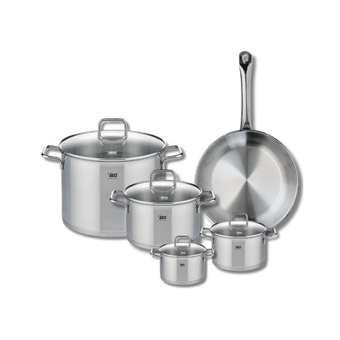 Découvrez l'ensemble de cuisine parfait pour toutes vos préparations culinaires : le lot comprend une poêle de cuisson de 28 cm et quatre faitouts de 12, 14, 20 et 26 cm de la collection Elo Profi Citrin.