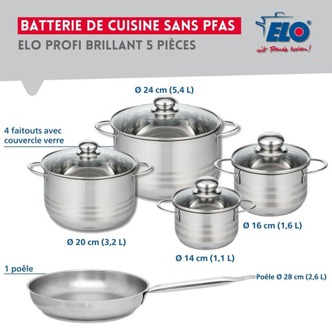 Découvrez l'ensemble de cuisine Elo Profi Brillant, comprenant une poêle de cuisson de 28 cm et quatre faitouts de 14, 16, 20 et 24 cm, tous en inox de haute qualité.