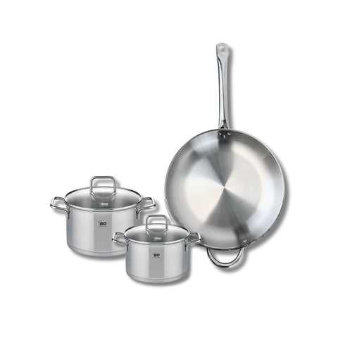 Découvrez l'ensemble de cuisine Elo Profi Citrin, qui allie qualité et performance. Cet ensemble comprend une poêle de cuisson de 32 cm et deux faitouts de 16 et 20 cm, tous fabriqués en inox de haute qualité.