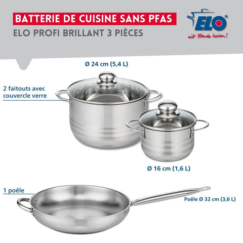 Ensemble de 1 Poêle de cuisson 32 cm et 2 faitouts 16 et 24 cm Elo Profi Brillant