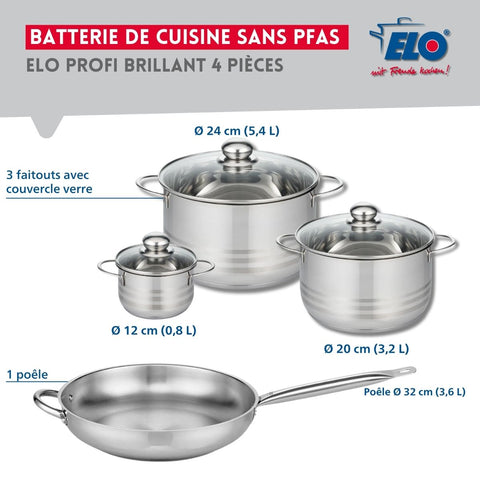 Ensemble de 1 Poêle de cuisson 32 cm et 3 faitouts 12, 20 et 24 cm Elo Profi Brillant