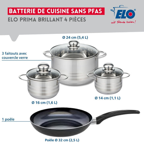 Ensemble de 1 Poêle de cuisson 32 cm et 3 faitouts 14, 16 et 24 cm Elo Prima Brillant