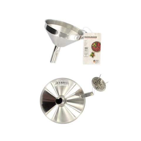 Fackelmann vous propose ce set de 2 entonnoirs de cuisine en inox afin de remplir bouteilles et bocaux avec vos jus faits maison, cocktails, punchs ou encore des soupes. L'entonnoir permet également de remplir une bouteille correctement avec de la vinaigrette que vous pouvez emporter chez vos amis ou en pique-nique.