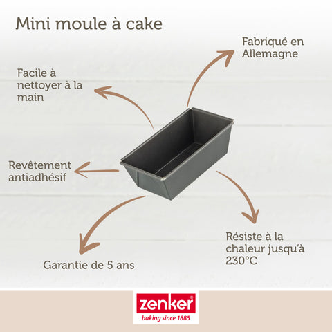 Zenker vous propose cet ensemble de 2 moules à cakes de 20 cm et 16 cm de long. Le mini moule à cakes est pratique pour confectionner des pâtisseries et gâteaux en petites portions pour deux ou trois personnes par exemple. Cela permet d'éviter les gaspillages. Dans un moule à cakes il est possible de cuire un gâteau, un cake salé, une brioche, une terrine, du pain de mie.