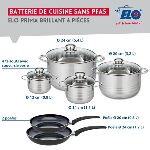 Découvrez l'ensemble de 2 poêles de cuisson et 4 faitouts Elo Prima Brillant, idéal pour tous vos besoins culinaires.