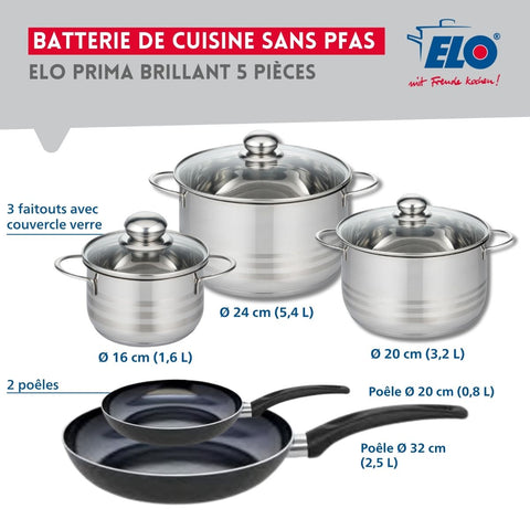 Ensemble de 2 Poêles de cuisson 20 et 32 cm et 3 faitouts 16, 20 et 24 cm Elo Prima Brillant