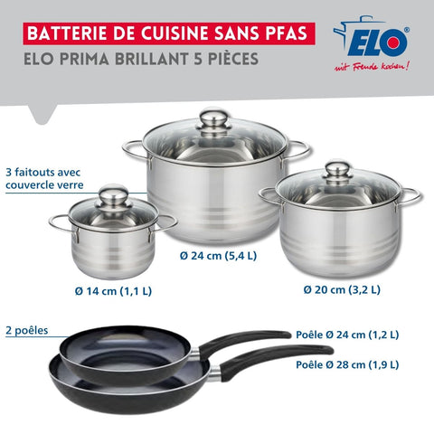 Découvrez l'ensemble de 2 poêles de cuisson et 3 faitouts Elo Prima Brillant, une batterie de cuisine complète pour tous vos besoins culinaires.