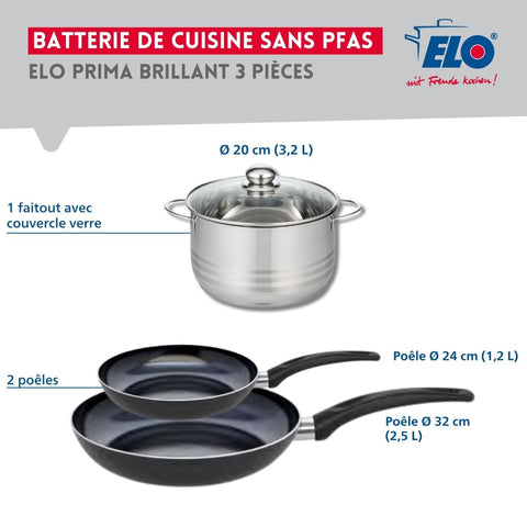 Ensemble de 2 Poêles de cuisson 24 et 32 cm et 1 faitout 20 cm Elo Prima Brillant