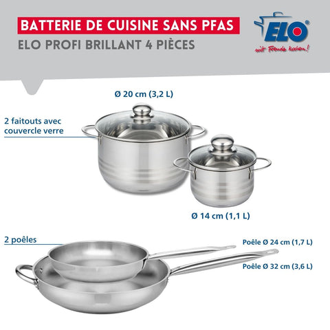 Ensemble de 2 Poêles de cuisson 24 et 32 cm et 2 faitouts 14 et 20 cm Elo Profi Brillant