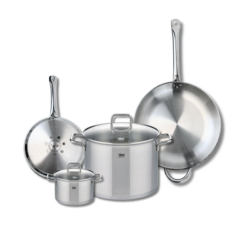 Découvrez l'ensemble de cuisine Elo Profi Citrin, comprenant deux poêles de cuisson de 24 et 32 cm ainsi que deux faitouts de 14 et 26 cm, conçus pour répondre à tous vos besoins culinaires.