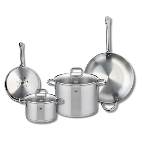 Découvrez l'ensemble de cuisine Elo Profi Citrin, comprenant deux poêles de cuisson et deux faitouts, parfait pour tous vos besoins culinaires.