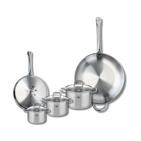Découvrez l'ensemble de cuisine Elo Profi Citrin, une batterie de cuisine complète et élégante, comprenant deux poêles de cuisson de 24 et 32 cm et trois faitouts de 12, 14 et 16 cm. Confectionnés en inox de haute qualité, ces ustensiles de cuisine sont non seulement esthétiques, mais aussi robustes pour une utilisation quotidienne.