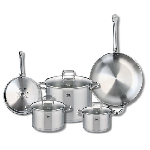 Découvrez l'ensemble de 2 poêles de cuisson et 3 faitouts Elo Profi Citrin, une batterie de cuisine complète en inox résistante à l'épreuve du temps.