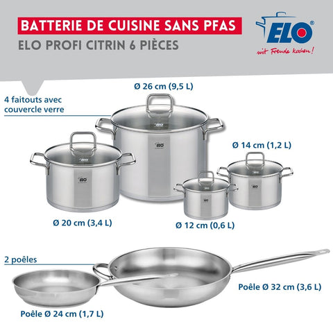 Découvrez l'ensemble de cuisine Elo Profi Citrin, qui comprend deux poêles de cuisson de 24 et 32 cm, ainsi que quatre faitouts de 12, 14, 20 et 26 cm. Fabriqués en inox de haute qualité, ces ustensiles sont conçus pour une robustesse exceptionnelle et une performance optimale en cuisine.